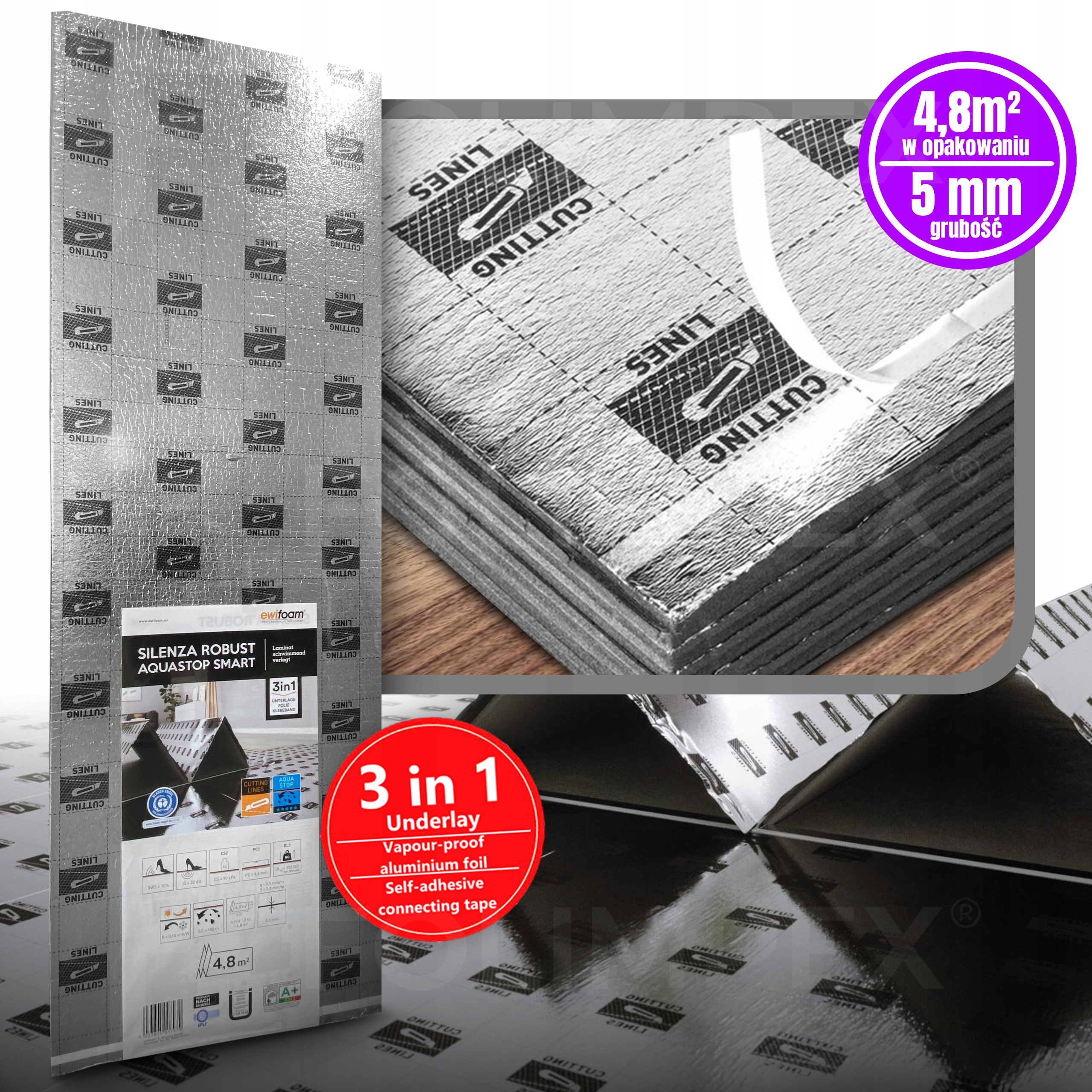 Ewifoam Silenza Robust Aquastop Smart 5мм 4,8м2 3в1 — технологичная подложка для пола, обеспечивающая исключительный комфорт и долговечность полов в твой дом. Он предлагает 3 функции в одном продукте — идеальное решение для тех, кто ищет надежность и удобство.