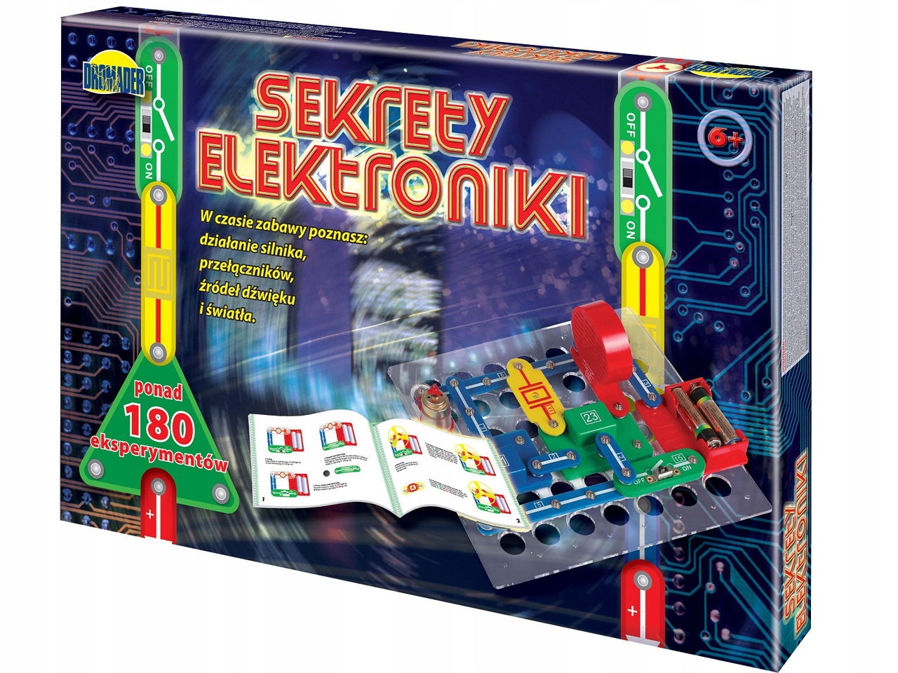 Набор Секреты электроники от Dromader позволяет провести 180 экспериментов, благодаря которым ваш ребенок научится принципам работы электронных систем, например, построит водный автомат. управляемый светодиод, узнайте, как работает двигатель и переключатели, источники света и звука.