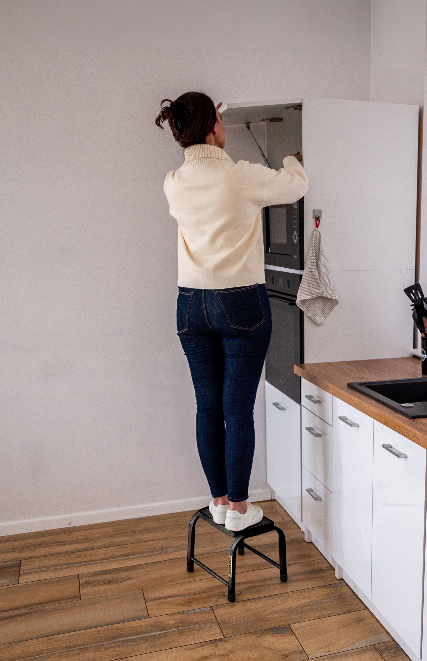Табуретка идеально подходит для мастерской, дома или кухни, облегчая доступ к более высоким полкам и труднодоступным местам в шкафах.