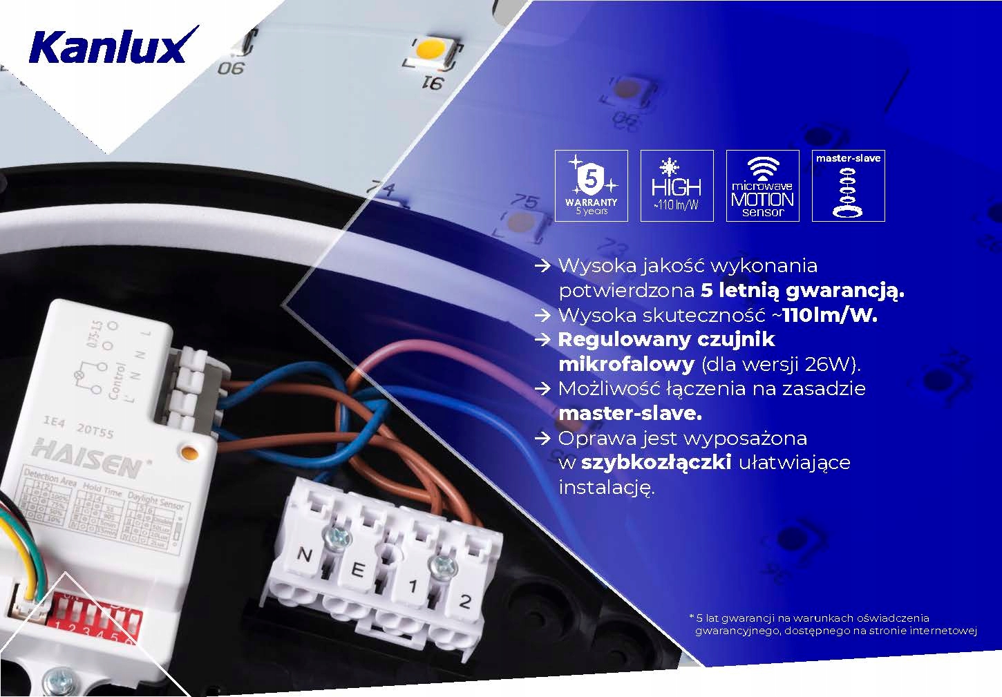 Kanlux DABA PRO — потолочные светильники для профессионального использования. Мы можем выбрать версию без датчика движения (25 Вт) или с датчиком (26 Вт) и два цвета корпуса — белый и черный. Kanlux DABA PRO – это герметичность IP65 и высокая устойчивость к погодным условиям, а также устойчивость к механическим повреждениям IK10 и дополнительная защита светильника от вскрытия. Потолочные светильники Kanlux DABA PRO можно соединять между собой по принципу MASTER → SLAVE, т.е. первый (первый и последний) светильник с датчиком управляет серией светильников. Высокое качество потолочных светильников Kanlux DABA PRO подтверждено гарантией 5 лет.