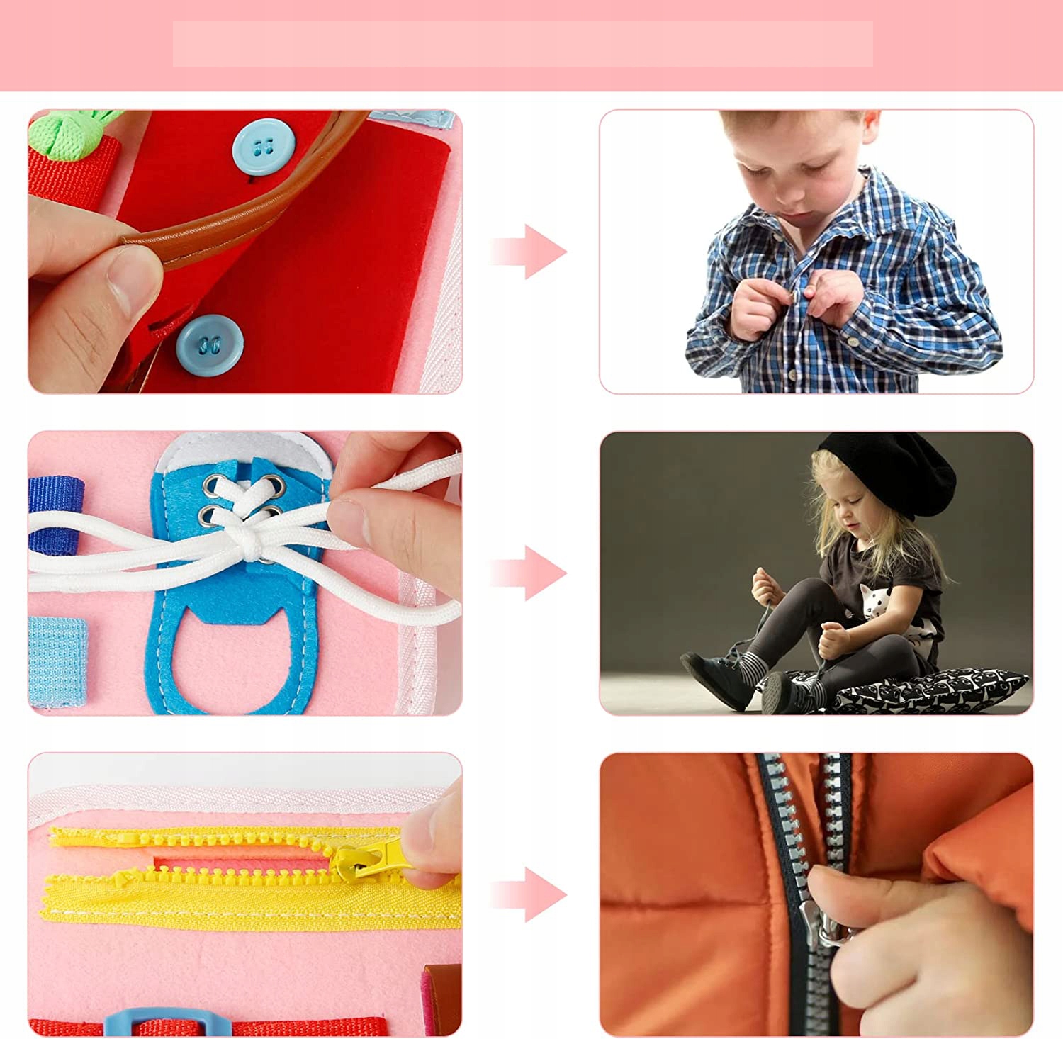 - Например, пусть маленькие дети учатся носить одежду, застегивать молнии, завязывать шнурки, пуговицы и формировать буквы.
