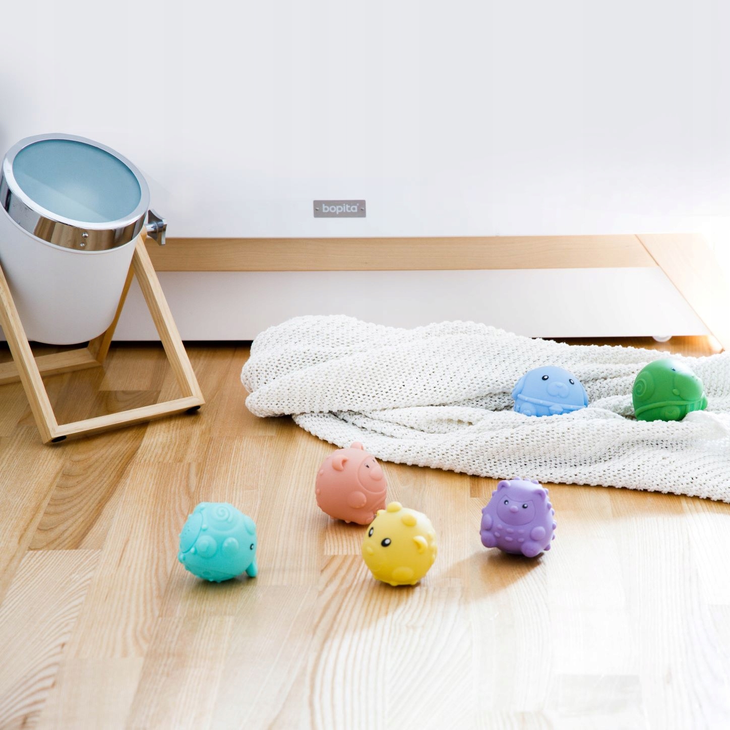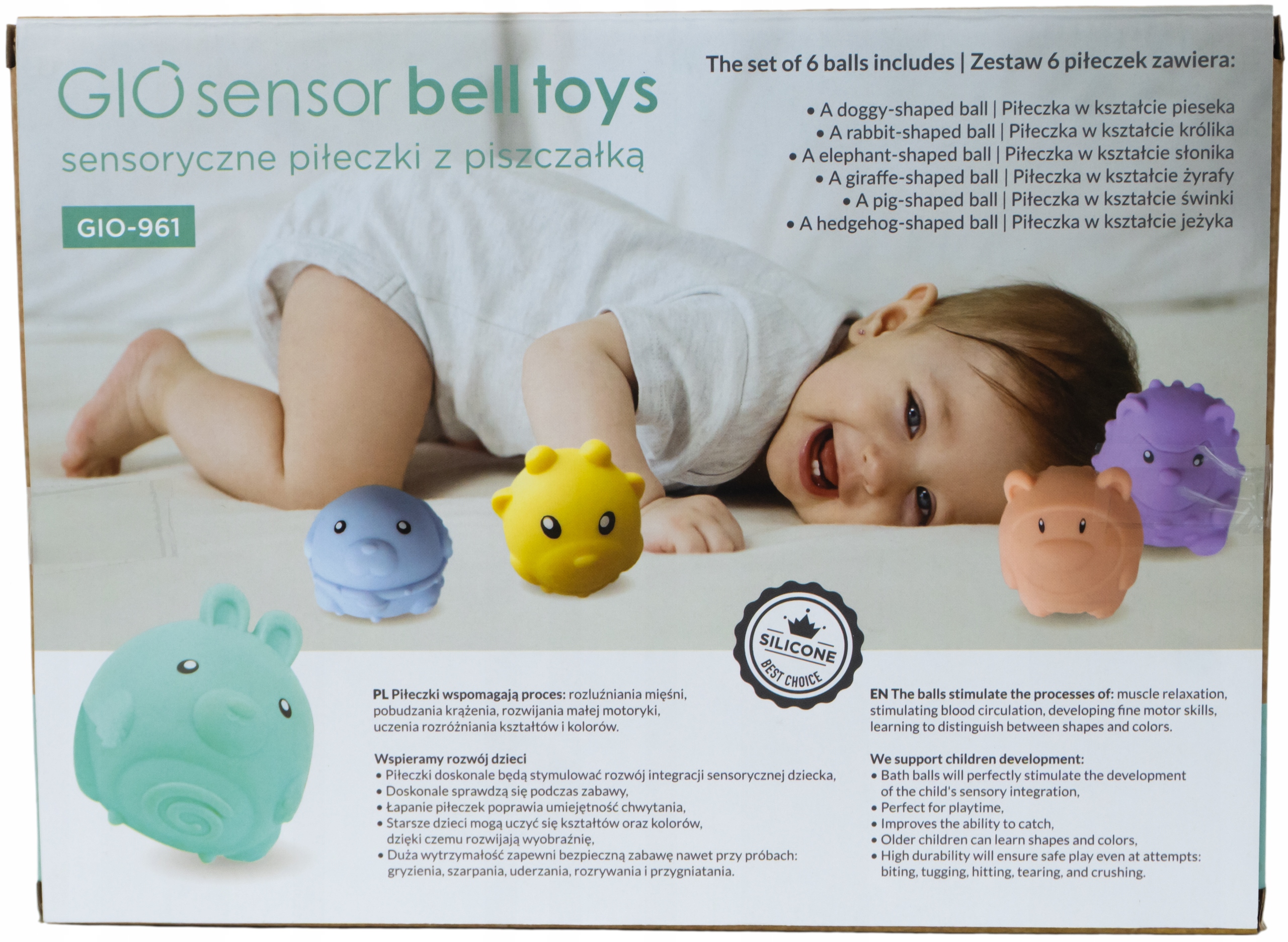 Набор из 6 пищащих шариков в форме различных животных. Благодаря специальным профилированным выступам они развивают моторику и воображение детей. Формы животных побуждают детей играть и изучать названия и цвета животных.