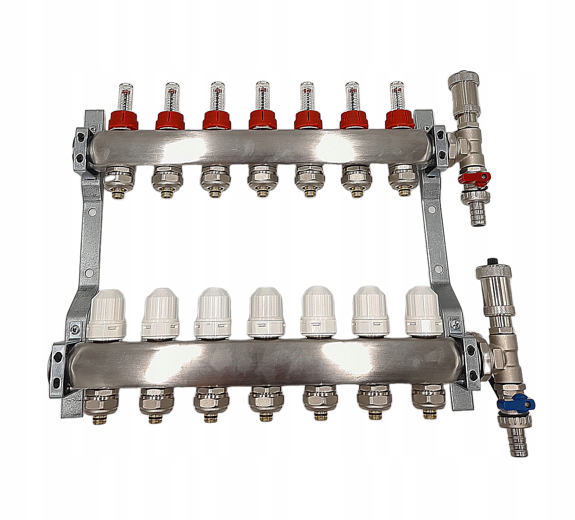 Стальной держатель для коллектора – это прочный и точно изготовленный элемент, используемый для крепления и устойчивого крепления коллектора в системе теплого пола. Благодаря своей конструкции он обеспечивает не только безопасную установку, но и точную адаптацию к конкретной модели коллектора. Эти ручки часто совместимы с другими элементами монтажа, что облегчает процесс установки, а также обеспечивает эстетичный внешний вид и долговечность. В результате стальная ручка эффективно удерживает распределитель в правильном положении, что обеспечивает правильную работу системы теплого пола.