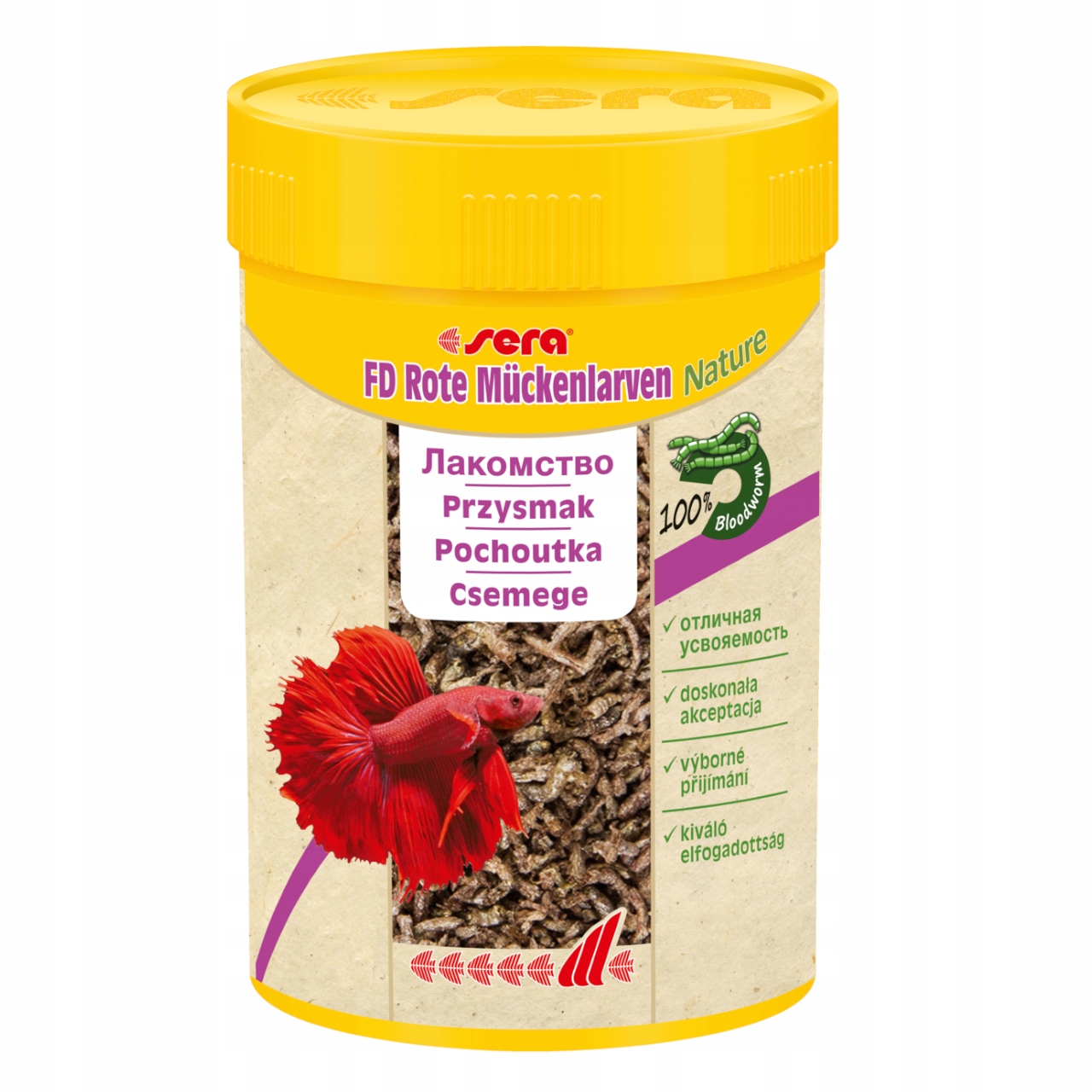 Мотыль SERA — это деликатес для рыб, преимущественно плотоядных, состоящий из 100% личинок красных комаров, которые , благодаря высокому содержанию белка и высокой привлекательности, особенно рекомендуются для привередливых рыб (например, свежевыловленных рыб, не привыкших к сухому корму).