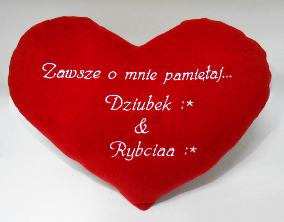 Подушка в форме сердца с вышитым посвящением.