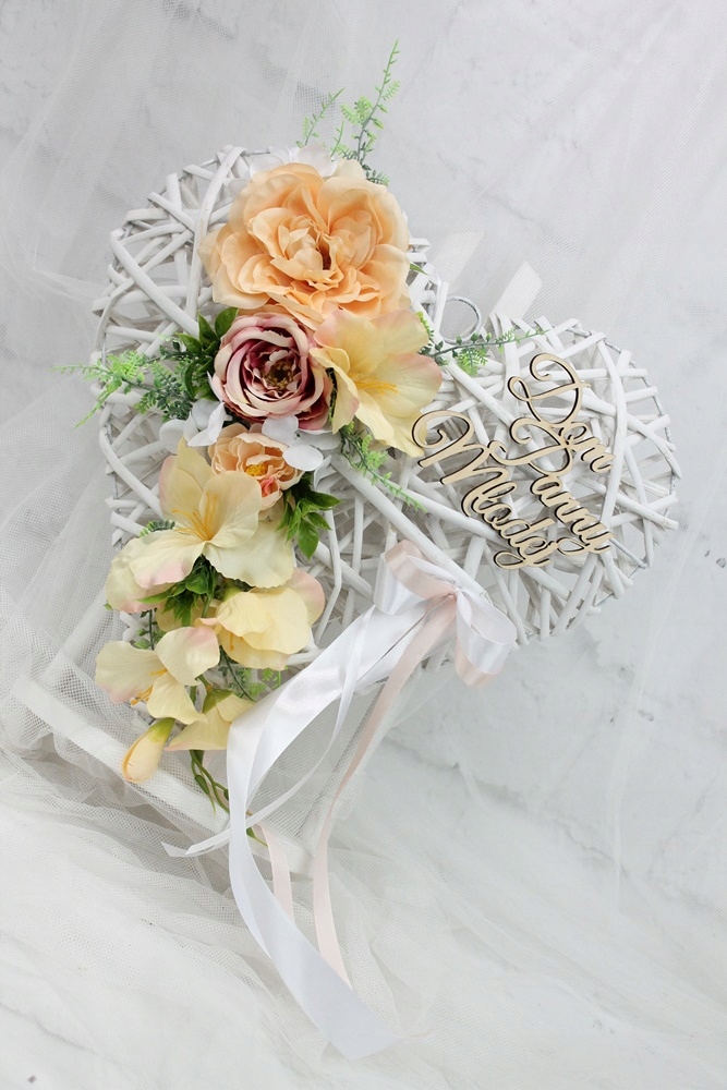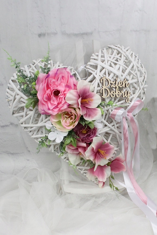 Плетеное беленое сердце диаметром 40 см, украшенное цветами, листьями и декоративной травкой, идеально соответствует современным тенденциям.