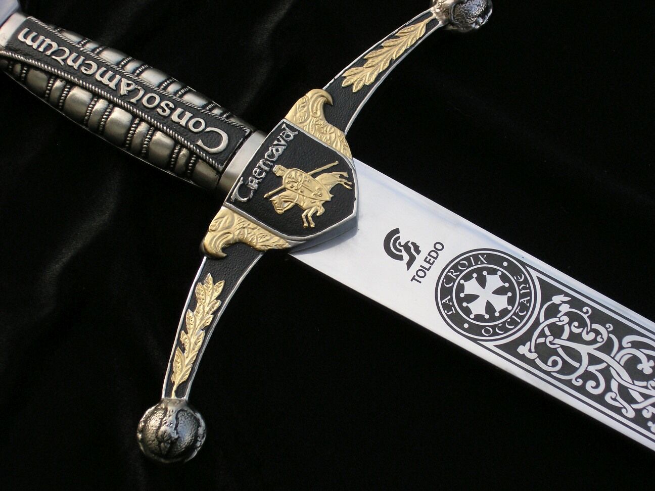 Рукоять: металл с богатой гравировкой - надпись Consolamentum - катарский ритуал сакраментального характера, обеспечивающего прощение грехов и символизирующего принятие верующих в группу Совершенных.