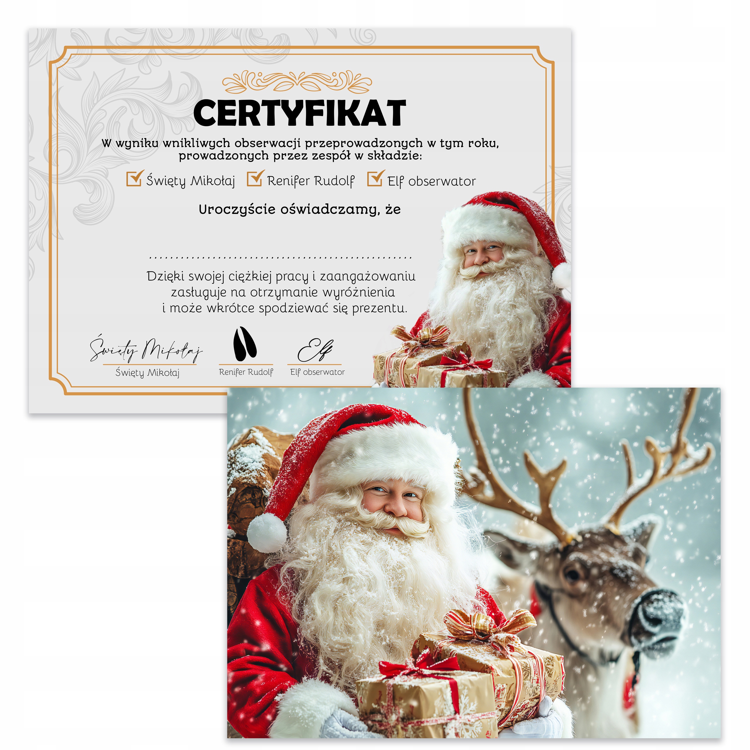 ✔️ Сертификат ДВУХСТОРОННИЙ - на одной стороне сертификат, на другой стороне фото Деда Мороза с Рудольфом и подарками :)