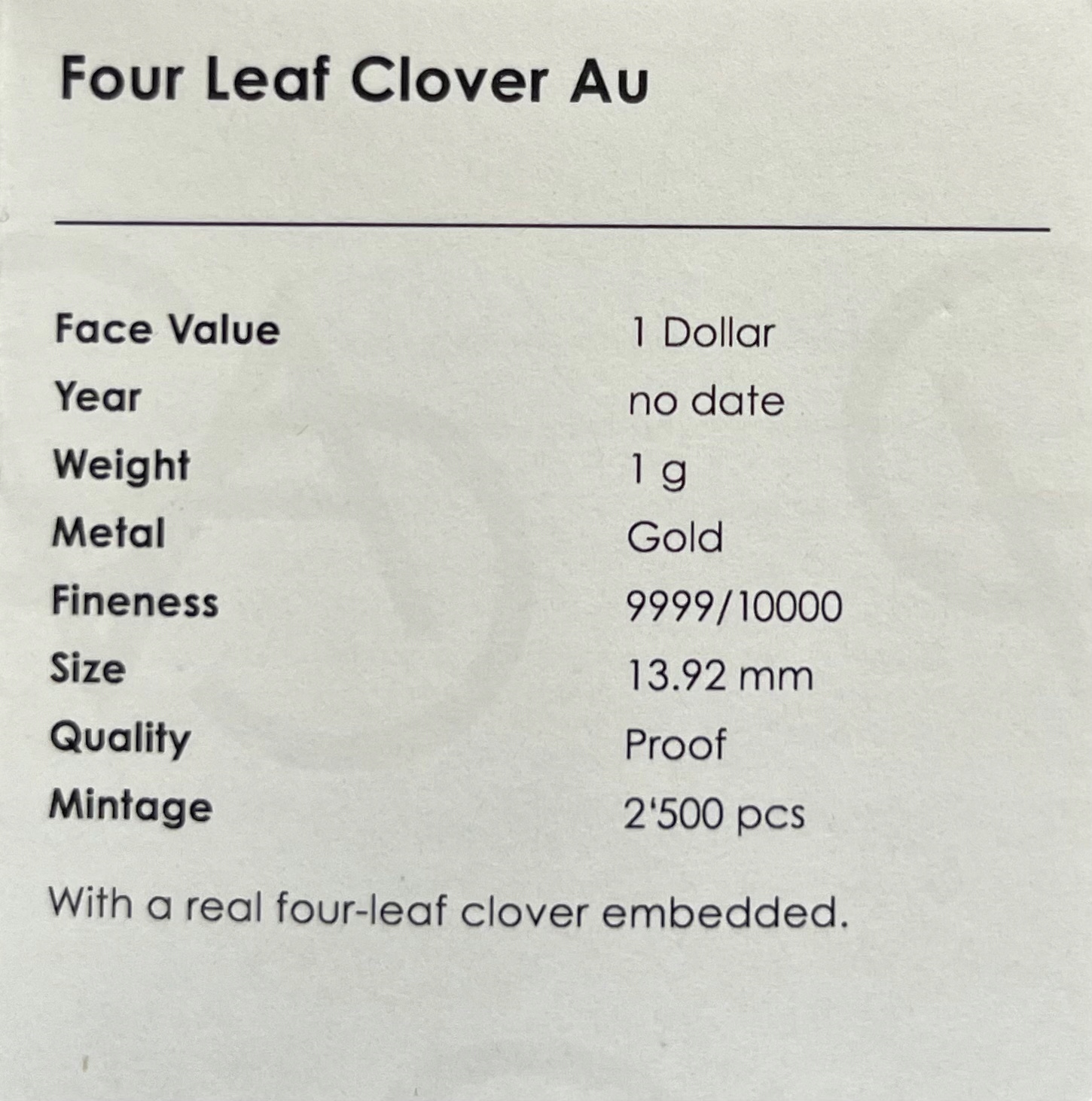 СЕРТИФІКАТ НА ЗОЛОТУ МОНЕТУ 1 ДОЛАР, ЧОТИРИЛИСНИК