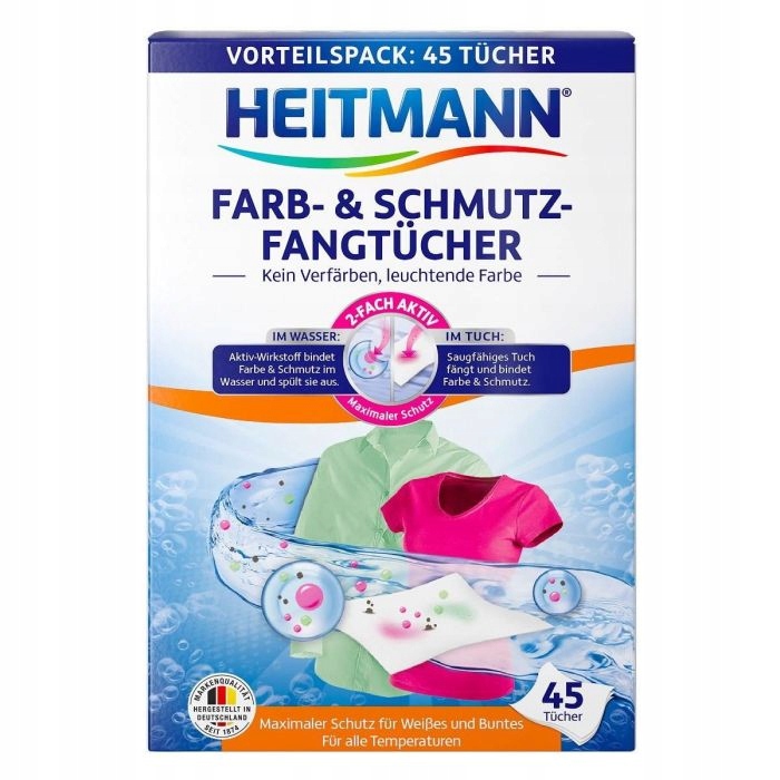 С этими салфетками вам не придется беспокоиться о случайном обесцвечивании. Импортные изделия Heitmann Farb&Schmutz распознают цвет и не позволяют ему проникнуть в ткань.