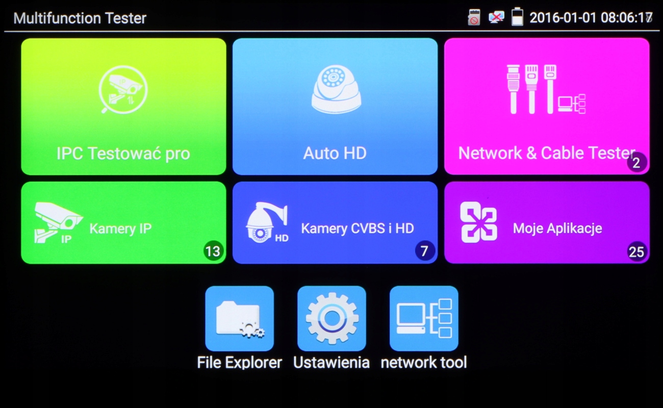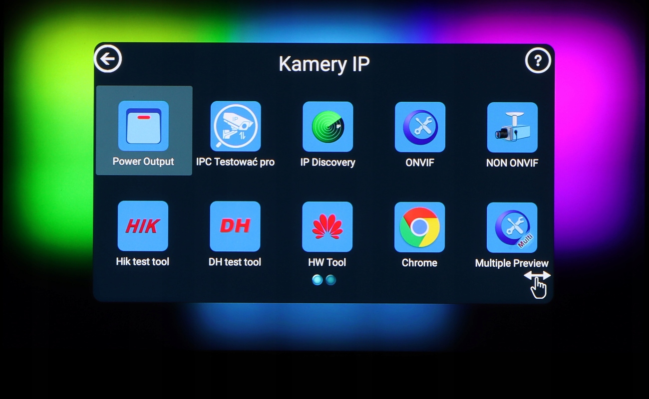 <р> Тест AHD-камеры Тест камеры HD-CVI Тест камеры HD-TVI Тест камеры PAL/NTSC Тест IP-камеры. Поддерживаемые методы сжатия изображения: H.265, H.264, MJPEG. Поддержка формата: 5 Мп, 16:9 HD-CVI, DAHUA Поиск и просмотр IP-камер, совместимых с Onvif Виртуальный МПК Калькулятор битрейта инструмент для тестирования DH Hik тестовый инструмент Инструмент тестирования UNV Инструмент ХуаВэй Управление поворотными столами и PTZ-камерами (купольными) Просмотр с IP-камер с помощью встроенных приложений — iVMS-4500 HD, EZView, gDMSS HD Lite, XMEye, MEye, Fseye Встроенный веб-браузер – Google Chrome. Мониторинг LAN-соединений сканер IP-адресов PING — проверка соединения с использованием ICMP-пакетов. Обнаружение подключенного порта в коммутаторе Тестер витой пары Взаимодействие с камерами и коммутаторами PoE PoE измеритель мощности Источник питания постоянного тока 12 В/48 В Монитор данных — монитор последовательного порта RS-485 Аудио тест Точка доступа – Wi-Fi Запись видео на карту micro SD с возможностью воспроизведения (не входит в комплект) Воспроизведение записей Калькулятор Встроенный фонарикРабочая температура: -10 °С ... 50 °С
