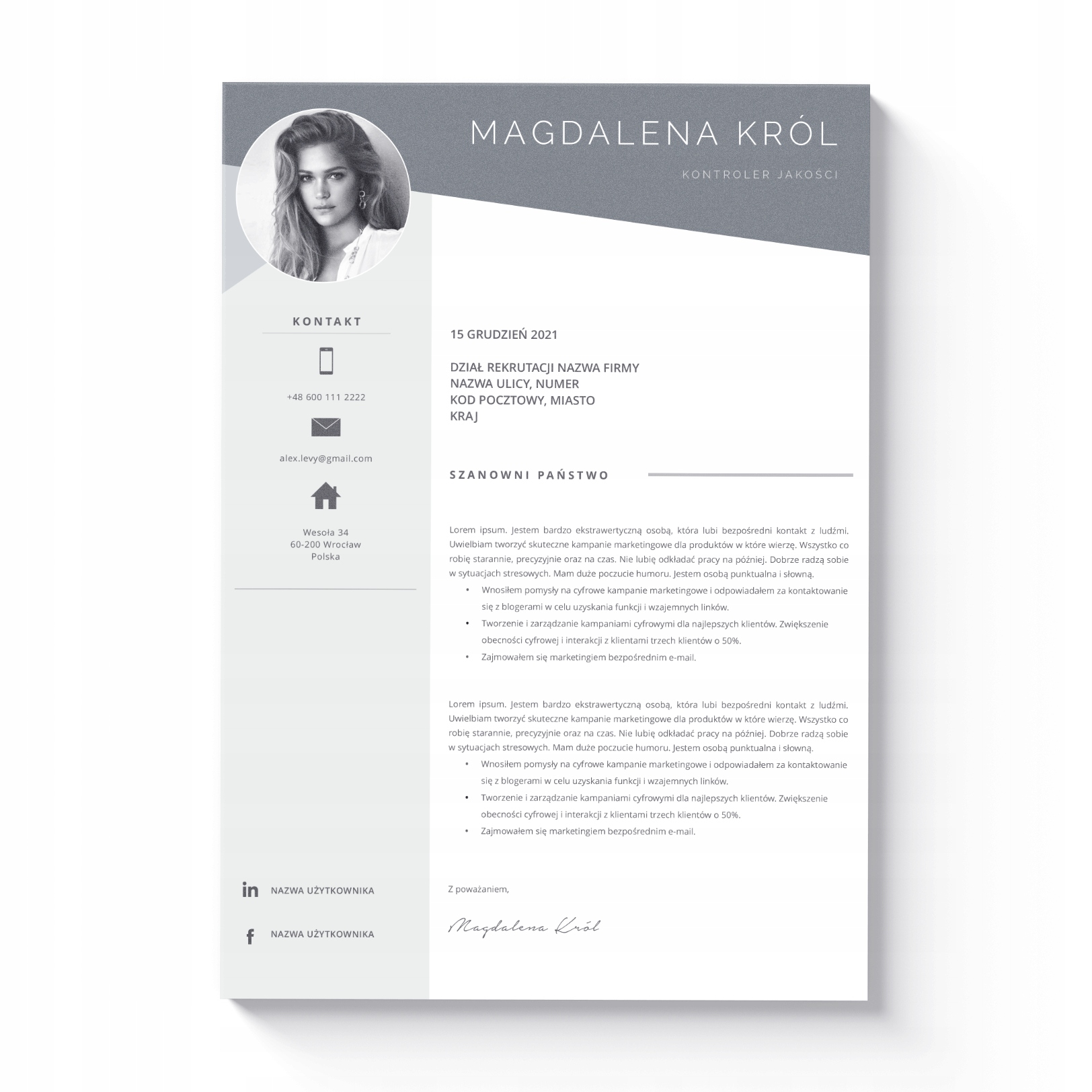 ШАБЛОН CV + СОПРОВОДИТЕЛЬНОЕ ПИСЬМО ПРОСТОЕ РЕДАКТИРОВАНИЕ СЛОВА