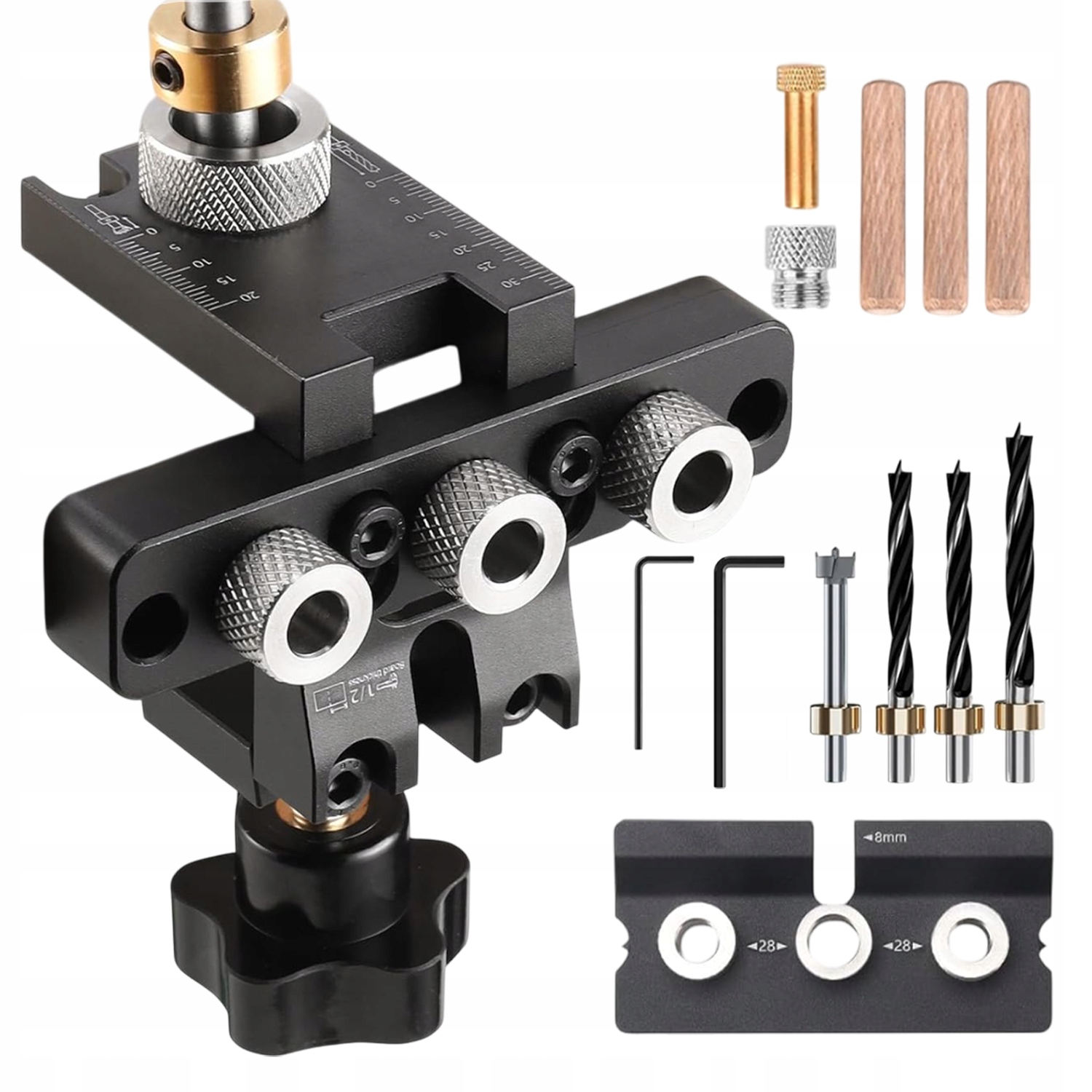 - Регулируемый штифтовый зажим включает в себя 1 карманный зажим 3-в-1, 1 латунный упор, 3 сверла (8 мм, 10 мм, 15 мм), 3 деревянных дюбеля, 2 шестигранных ключа, 1 предварительно установленное вспомогательное приспособление для позиционирования.