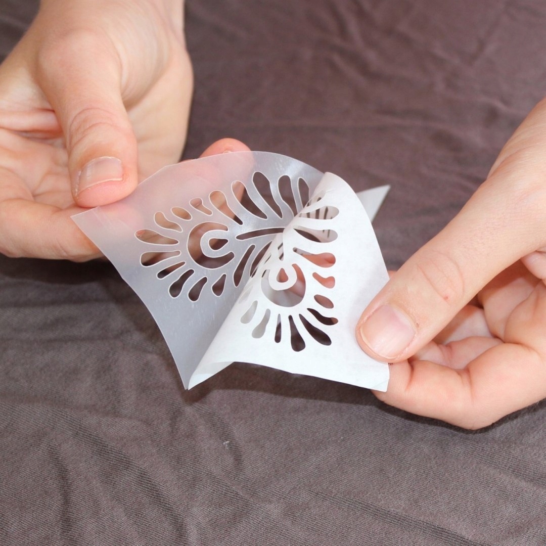 Клей на шаблоне непостоянный, что позволяет приклеивать его к различным поверхностям и легко удалять. При ровном приклеивании краска не вытекает снизу. Подходит для использования на тканях, бетоне, дереве, стекле и т. д. Можно использовать с акриловыми или натуральными красками, клеями, тканевыми красками или чернилами, структурными пастами, аэрозольными красками и т. д.