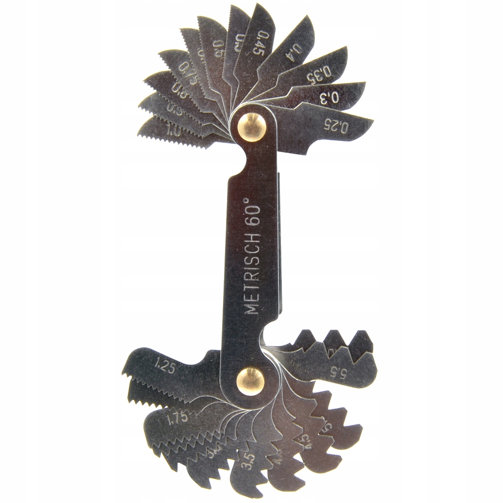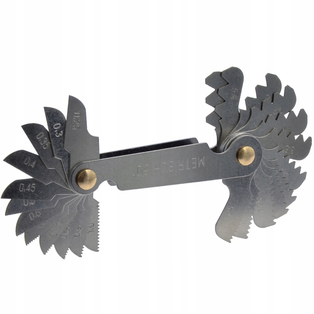 Измеритель потока потока. Шаблон GOG 24 ПК. Он используется для идентификации хода резьбы. Измеритель резьбы составляет от 0,25 до 6 мм. Устройство состоит из 24 листьев следующих размеров: