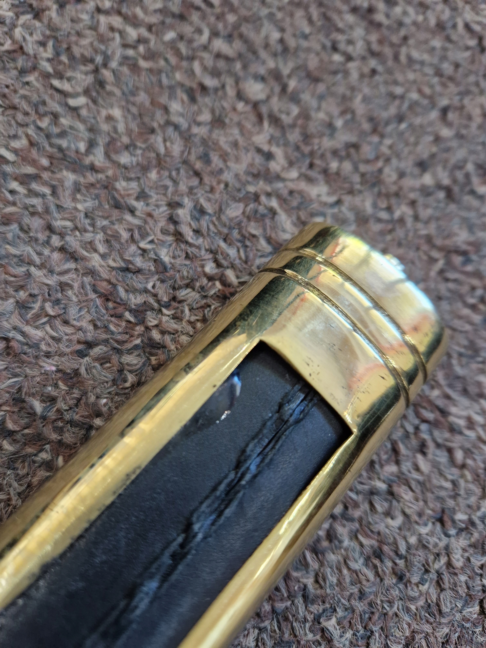 Ножны деревянные, обтянуты черной кожей и латунной фурнитурой. К верхнему краю прикреплены два ремня.