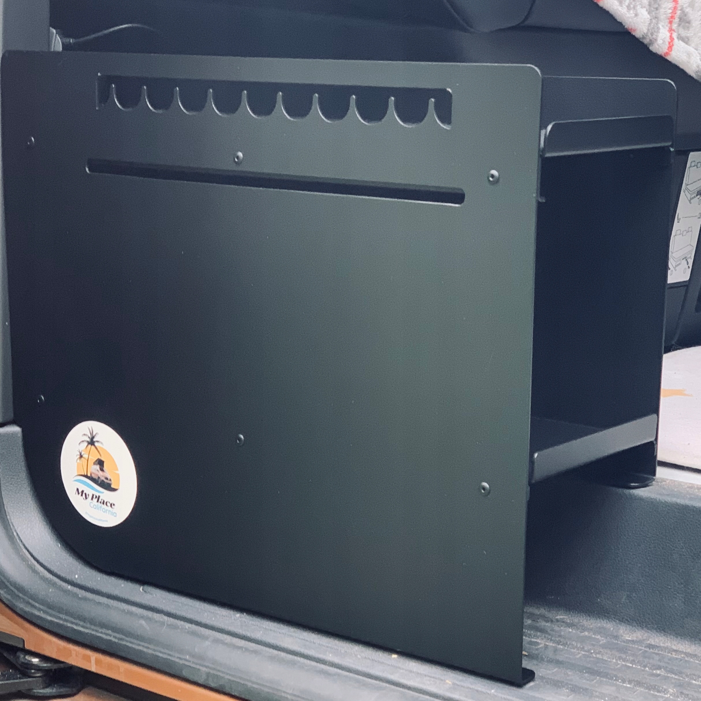 Шкаф, специально разработанный для Volkswagen Multivan, Калифорния, является необходимым оборудованием для каждого владельца Volkswagen. T5, T6, T6.1 Шкаф для обуви - дополнительное место для хранения обуви и других самых необходимых предметов. Специально разработан, чтобы вы могли использовать дополнительную таблицу в качестве дополнительной внешней таблицы. Изготовлен из высококачественного алюминия, окрашенного в порошок, верхней полки - черного цвета. Шкаф может быть подключен к нашему столу и с держателем напитков. Полная/вентиляционная решетка
