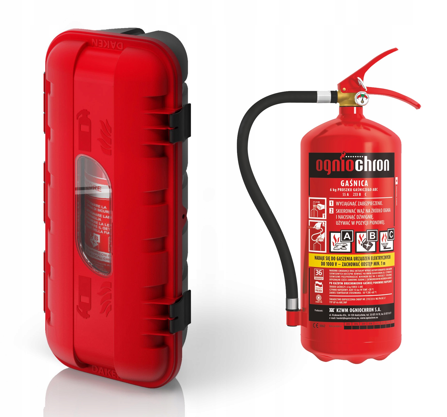Ящик/шкаф для огнетушителя 6 кг известной итальянской компании DAKEN, модель STRIKE + Порошковый огнетушитель 6 кг, модель GP-6X ABC/MP от OGNIOCHRON