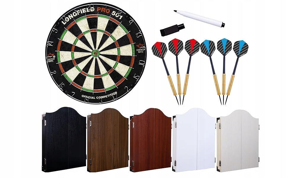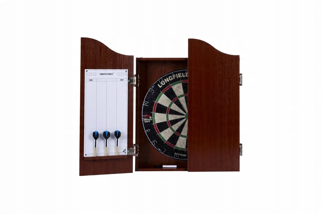 Комплектация, шкаф для дартс Longfield. Полноразмерная доска висит в запираемом шкафу, а с шестью дротиками вы можете сразу же начать играть в дартс. В набор также входит мел и ластик, благодаря которому можно отслеживать результаты.