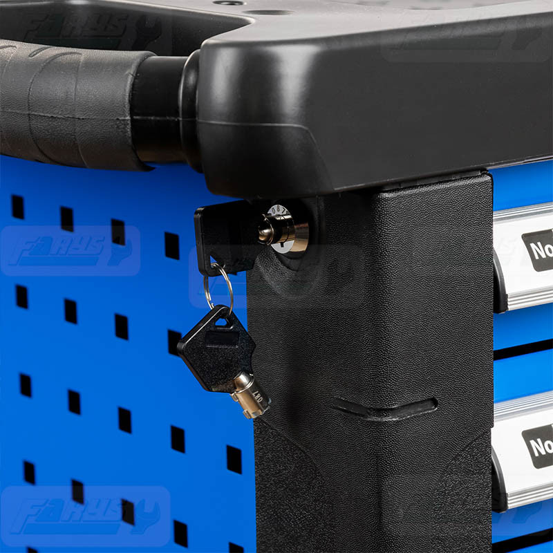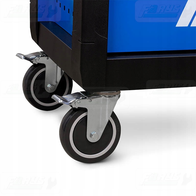 Шкаф для инструментов от Farys. Верхняя часть шкафа изготовлена из полипропилена, оснащена эргономичной ручкой, интегрированной со столешницей, что обеспечивает удобную транспортировку шкафа. Наш шкаф оснащен центральным замком с двумя ключами, которые запирают все ящики, что очень удобно при работе на наклонных поверхностях. Ящики установлены на шарикоподшипниках, все ящики полностью выдвигаются. На колесе имеется тормоз, а бока шкафа облицованы противоударным материалом, благодаря чему коляску сложно повредить.