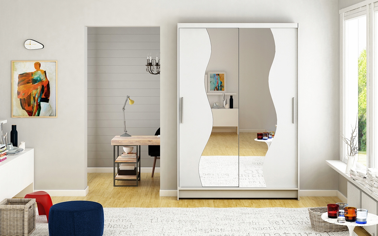 Двухдверный шкаф с системой раздвижных дверей и зеркалами, облегчающими повседневное использование. Современный, функциональный и элегантный. Предназначен для безопасного хранения одежды и других личных вещей. Идеально подходит для спальни, гостиной или холла. В гардеробе есть длинные вертикальные зеркала, чему наверняка будет рада каждая женщина.