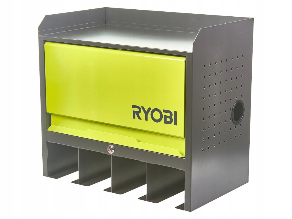 Шкаф для инструментов RYOBI RHWS-01 имеет одну внутреннюю полку и верхнее отделение для хранения, а также отверстия в боковой панели для подвешивания дополнительных аксессуаров.