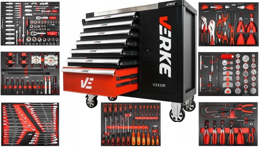 Шкаф для инструментов Verke имеет 7 практичных ящиков для инструментов, закрывающихся на центральный замок( мы закрываем все ящики одним замком).
