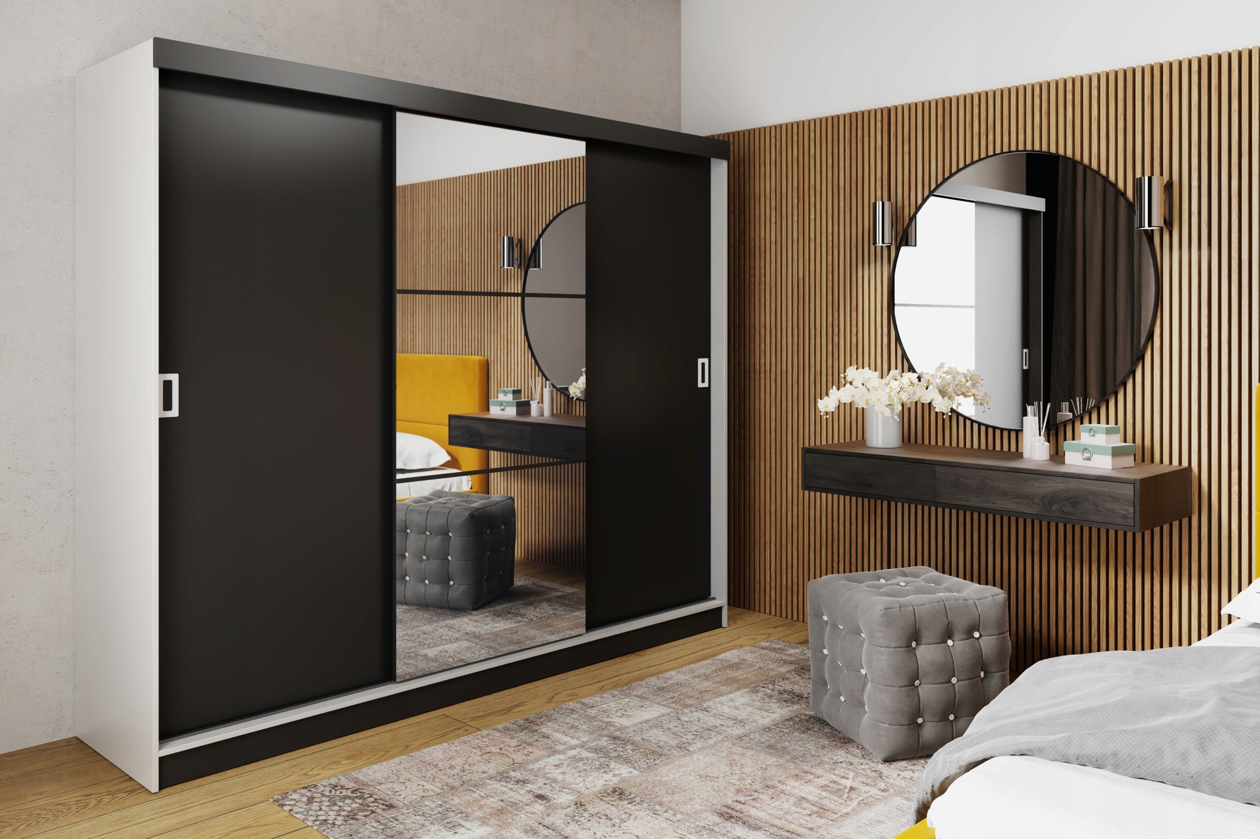 - Зеркало гардероба декорировано черными полосками для самостоятельной сборки.