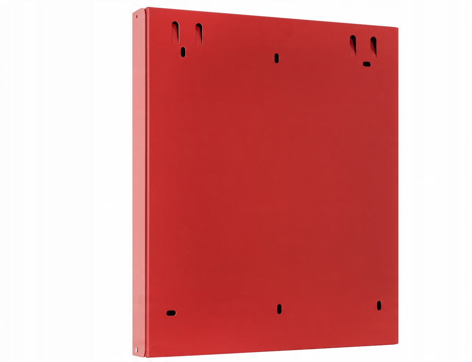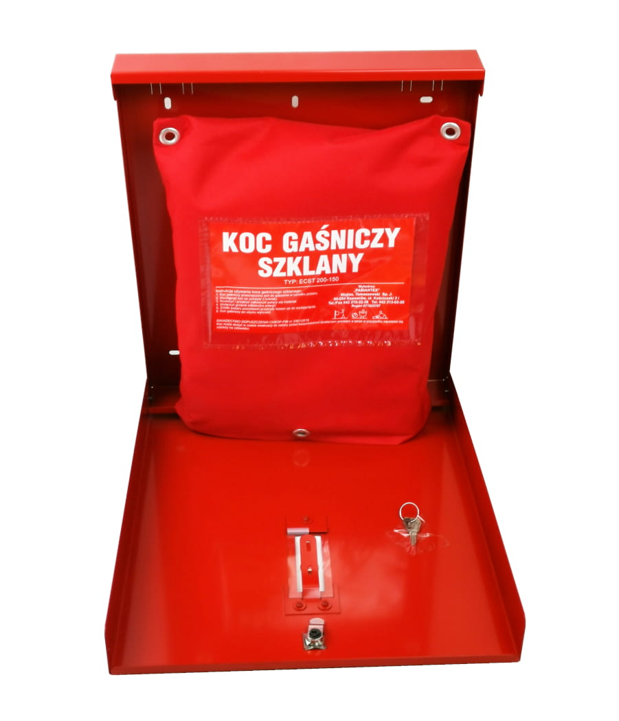 Отделка: Стальной лист, окрашенный полиэфирно-эпоксидной порошковой краской. Дверь полная. Шкафы изготовлены из листового металла и имеют маркировку «Пожарное одеяло». Стандартный цвет – красный (RAL 3000).