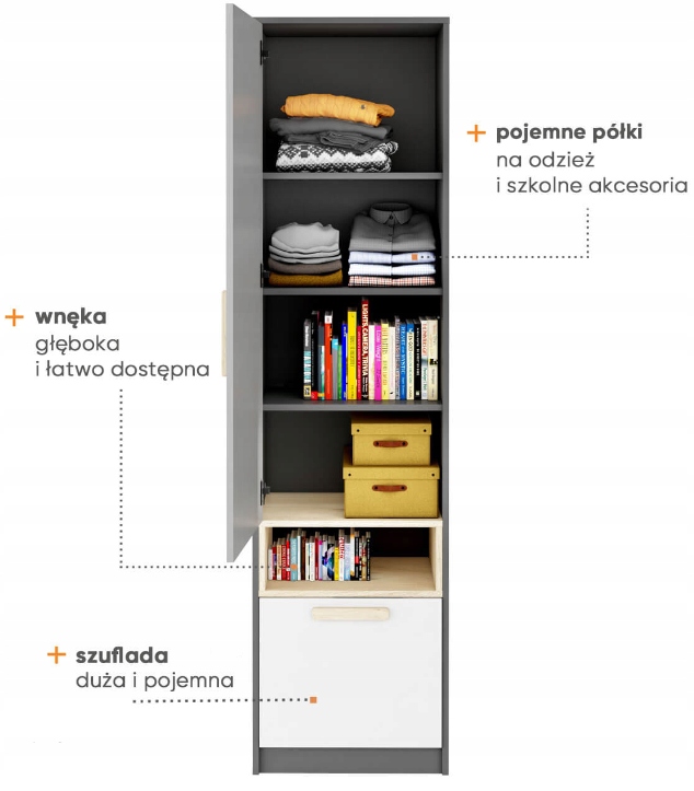 Шкаф Pok – классическое предложение, характеризующееся современным дизайном и высокой функциональностью. Неподвластный времени стиль мебели гарантирует ее использование с детства до школьных лет. Простые, просторные формы коллекции POK придадут интерьеру необыкновенную энергию. Благодаря альтернативным цветам, сочетающим модный графит с серым и теплый оттенок бука Ибсена с белым, новая комната понравится как девочкам, так и мальчикам.