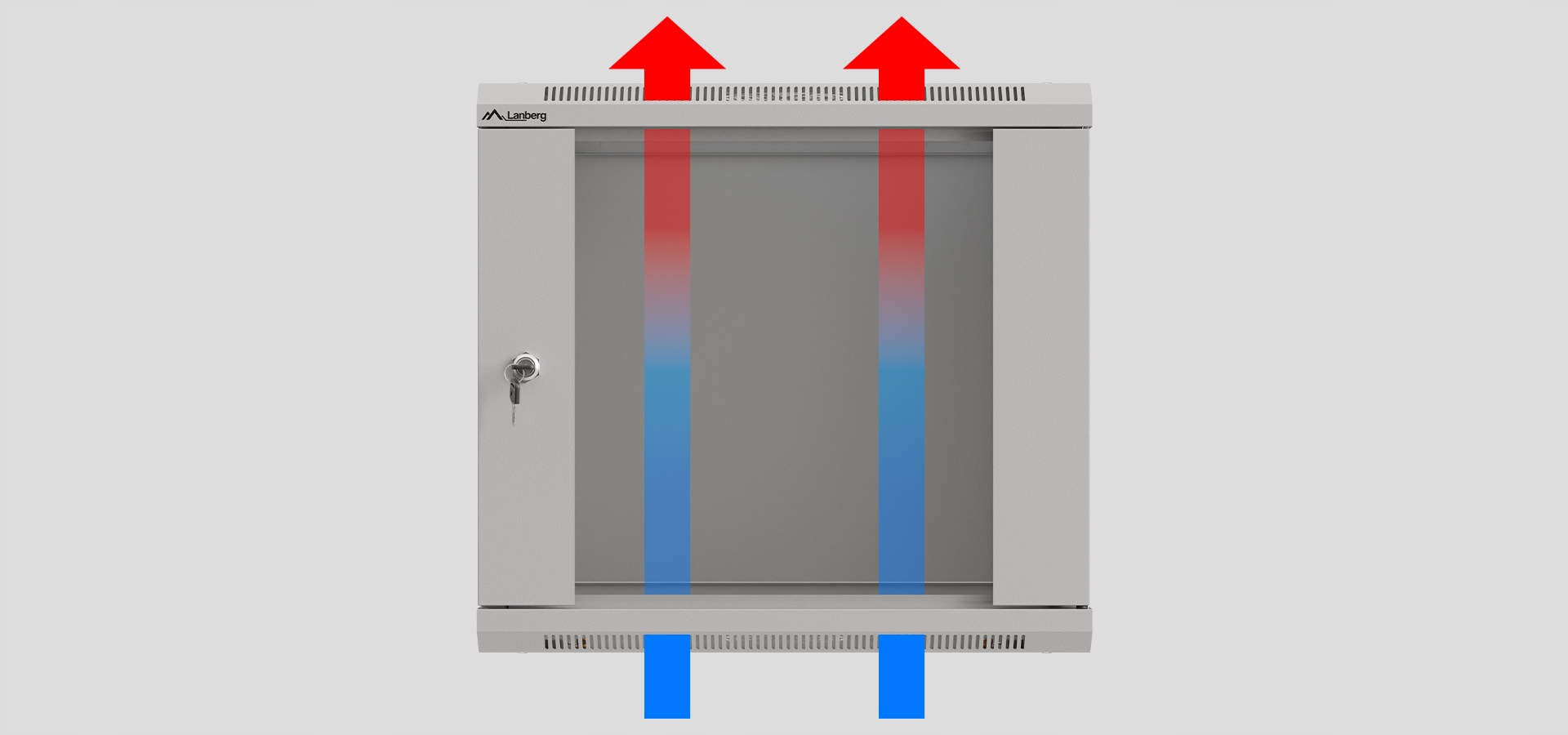 Для обеспечения достаточного притока воздуха в верхней и нижней панелях имеются вентиляционные отверстия. Дополнительно в шкафу имеется специальное место для установки вентилятора размером 120х120 мм, что существенно улучшает циркуляцию воздуха и снижает риск перегрева оборудования. Благодаря этому шкафы WF03 обеспечивают оптимальные условия эксплуатации установленного в них оборудования и длительный срок его службы.