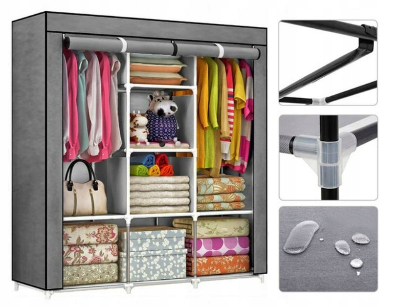 Конструкция из стального каркаса. На каркас гардероба крепится дышащий чехол. Ее легко содержать в чистоте, она практична и идеально подходит для хранения мелких вещей. Легкая и прочная конструкция. Ее можно складывать и перемещать в любое время. Полки изготовлены из водостойкого флизелина, материал легко чистится.