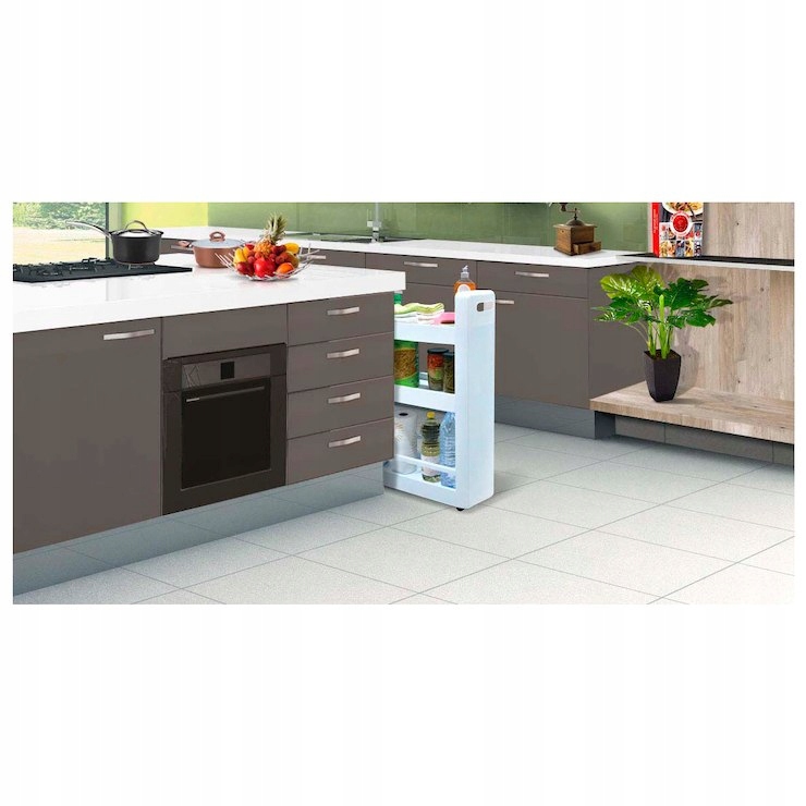 Он поместится даже в очень маленьком пространстве, предоставив дополнительное место для хранения вещей. Он позволяет максимально использовать небольшое помещение и в то же время обеспечивает удобный доступ к хранящимся вещам. Идеально подходит для небольшой ванной комнаты, на полочках легко можно расположить любую косметику или моющие средства. Облегчает использование неиспользуемого или неорганизованного пространства на кухне, его можно поставить между шкафами или спрятать под столом, тогда на полках легко разместится банки, бутылки, кухонная утварь или кулинарные книги. Шкаф имеет 4 колеса, которые позволяют легко перемещать его. Белый цвет и простой рисунок позволяют вписаться в большинство интерьеров.