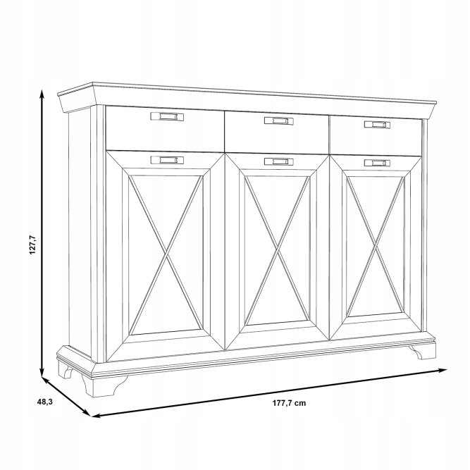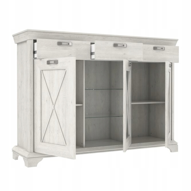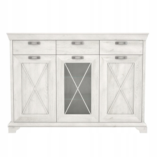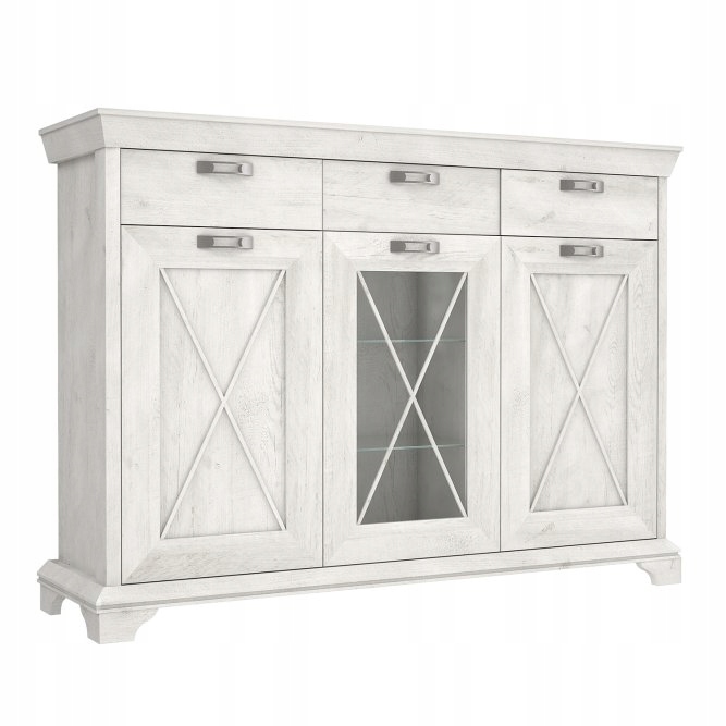 Низкая трехдверная витрина станет прекрасным дополнением стилизованной столовой. Богатый декор - рамочные фасады, элегантные крестообразные стойки, тонко фрезерованный верхний венец, массивный цоколь и стилизованные ножки - придают ему неповторимый характер и создают романтическую атмосферу. Витрина шириной почти 180 см оснащена тремя ящиками, двумя шкафами и одним стеклянным шкафом.