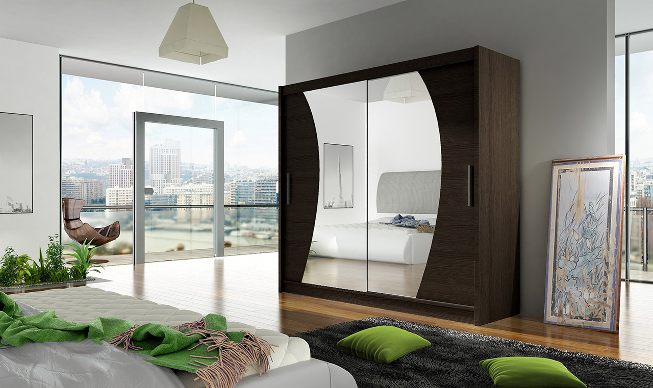 Двухдверный шкаф с системой раздвижных дверей и зеркалами, облегчающий повседневное использование. Современный, функциональный и элегантный. Предназначен для безопасного хранения одежды и других личных вещей.