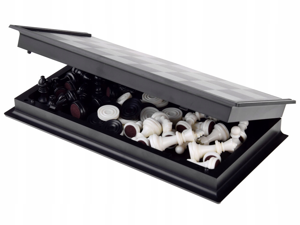 Набор 2 в 1: магнитные шахматы + шашки — самые популярные и известные настольные игры во всем мире. В комплект входит набор: шахматные фигуры и шашки, а также элегантная пластиковая коробочка, которая в разложенном виде служит доской. Упаковка не очень большая, а благодаря легкому материалу набор не тяжелый – его можно брать с собой куда угодно, что делает его идеальным для путешествий. Благодаря магнитным шахматным фигурам и доске начать игру можно даже в машине, автобусе, поезде и т.п. или в саду, на пикнике и т.п.