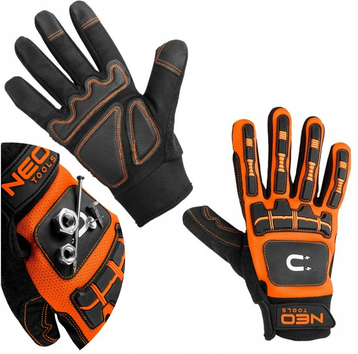 Рабочие перчатки NEO Tools с Магнит — практичное решение для каждого любителя DIY. Встроенный магнит на тыльной стороне руки позволяет удобно удерживать винты, гайки и мелкие металлические элементы, чтобы во время работы все было под рукой.