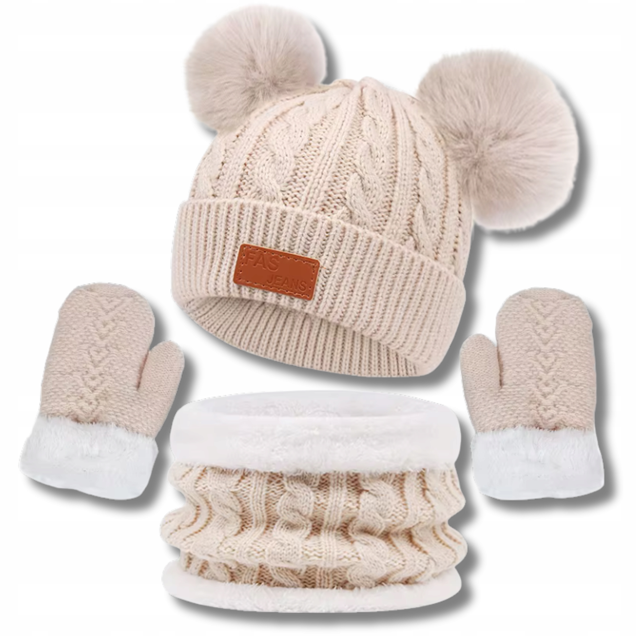 Вы ищете полный зимний набор для своего ребенка? Этот набор 3-lement является идеальным решением для холодных дней! Комплект включает в себя шляпу с очаровательными помпонами , теплой трубной дымоходом и мягкие перчатки , которые вместе создают практическое и стильное дополнение к гардеробу малыша. Обеспечивает полное ношение комфорта. теплой меховой подкладка защищает от ветра и мороза, и в то же время дружелюбна к нежной коже ребенка . Это отличный выбор для прогулок, игр и ежедневных результатов зимой.
