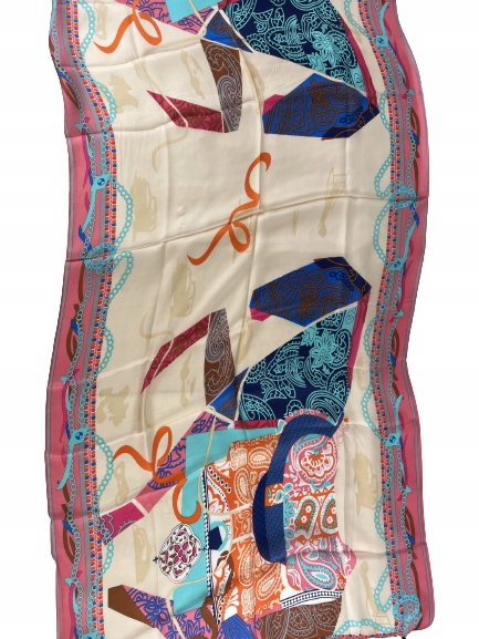 Шарф с очень оригинальным узором из художественных образов, который мы носим в текущем сезоне. Они изготовлены из шелка, поэтому хорошо сядут и лягут поверх блузки или жакета.