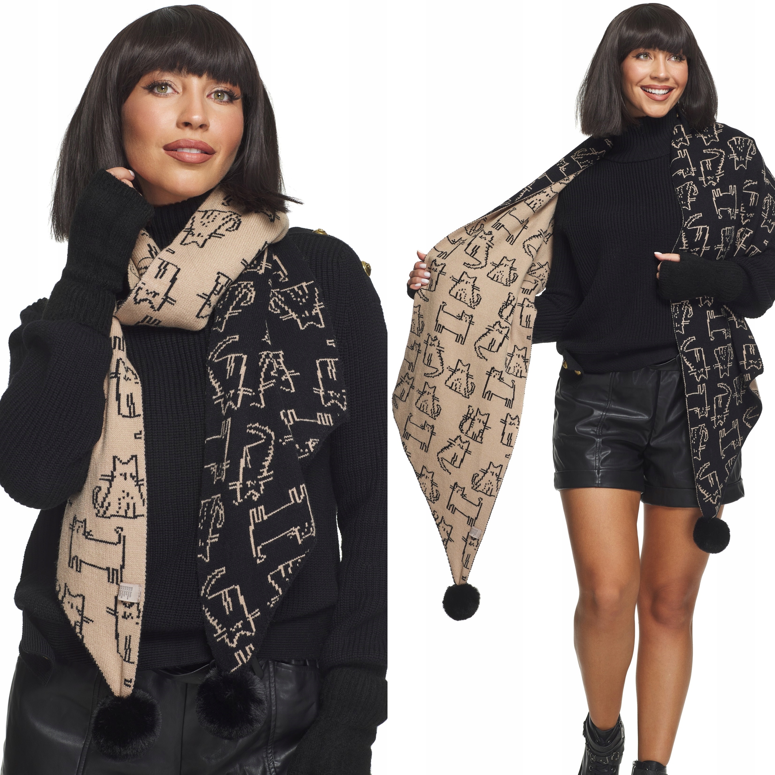 ШАРФ з помпонами, котячий малюнок, тепла зима