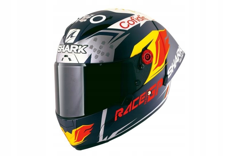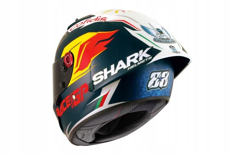 Shark Race-R Pro GP. Компания Shark создала свой самый спортивный шлем Race-R Pro GP и оснастила его новейшими технологическими достижениями. Внешняя оболочка изготовлена на основе COVA (углеродное волокно и арамид), формы подобраны таким образом, чтобы минимизировать взаимодействие шлема с другими элементами мотоциклетной одежды. Задний спойлер был улучшен для улучшения аэродинамики и устойчивости шлема на высоких скоростях. Это вершина опыта SHARK в сериях MotoGP и WorldSBK.