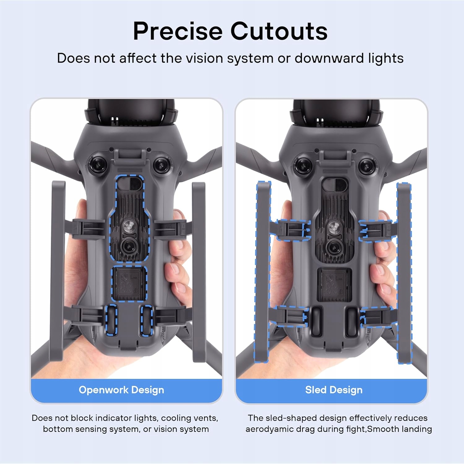 - Эксклюзивный дизайн: Ноги шасси разработаны специально для DJI Mavic 4 Pro и подходят к фюзеляжу, не блокируя индикаторные лампы, вентиляционные отверстия, систему обнаружения дна и систему обзора.