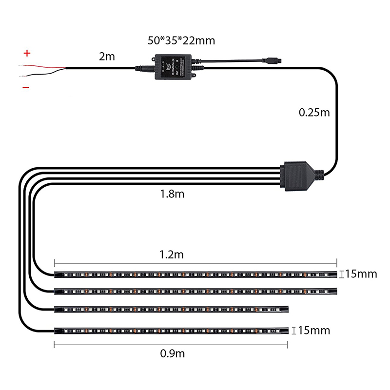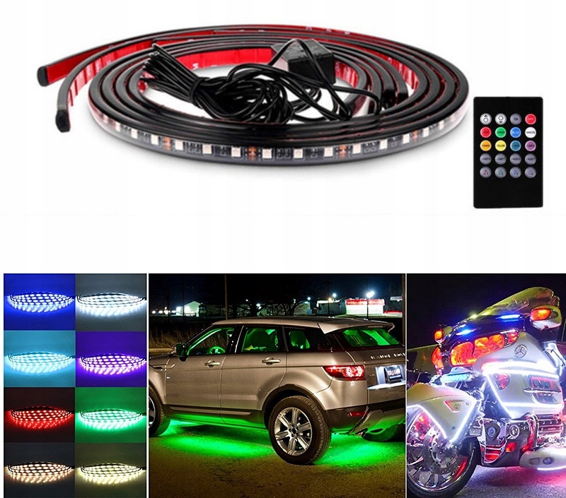 Четыре полоски управляются с помощью беспроводного пульта дистанционного управления. Полоски гибкие, что облегчает установку под шасси автомобиля. Их также можно установить в багажнике, на двери багажника, под решеткой и т. д. Они изготовлены из ПВХ-материала с двусторонним скотчем для удобства установки.