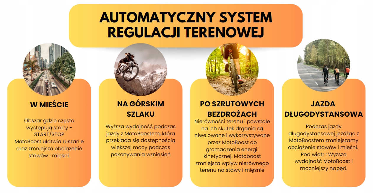 Шатуны MotoBoost представляют собой механизм со встроенной системой, называемой системой автоматической регулировки для бездорожья. Ее эффективность была доказана тремя японскими университетами и представлена на конференции Общества инженеров-механиков в Японии.