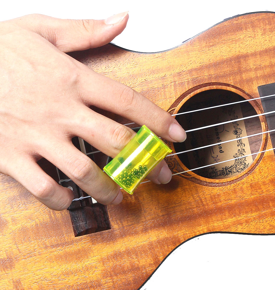 Маленькая погремушка на резинке, которая при надевании на палец разнообразит игру практически на любом инструменте: гитаре, гавайской гитаре, кахоне, бонго...
