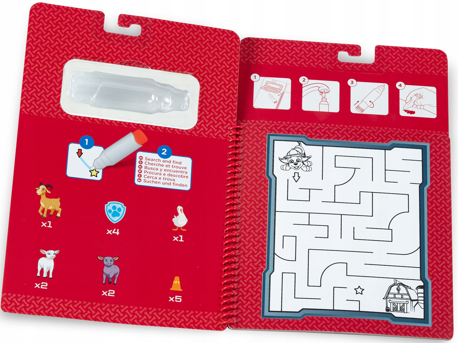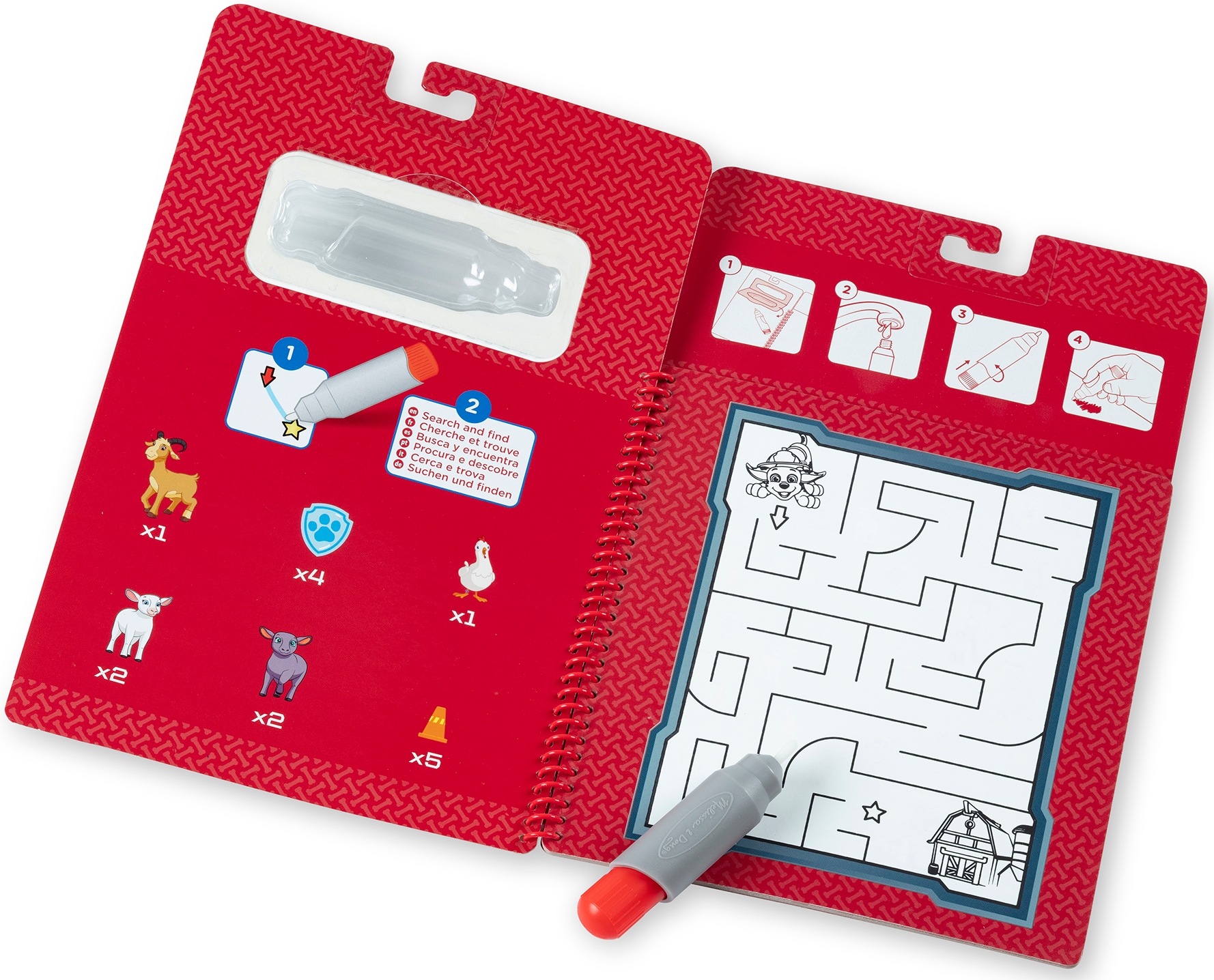 Книга с четырьмя картинками на колесиках, благодаря которым страницы легко переворачиваются + специальная ручка в форма кисти - просто налейте в середину немного воды и закрасьте.