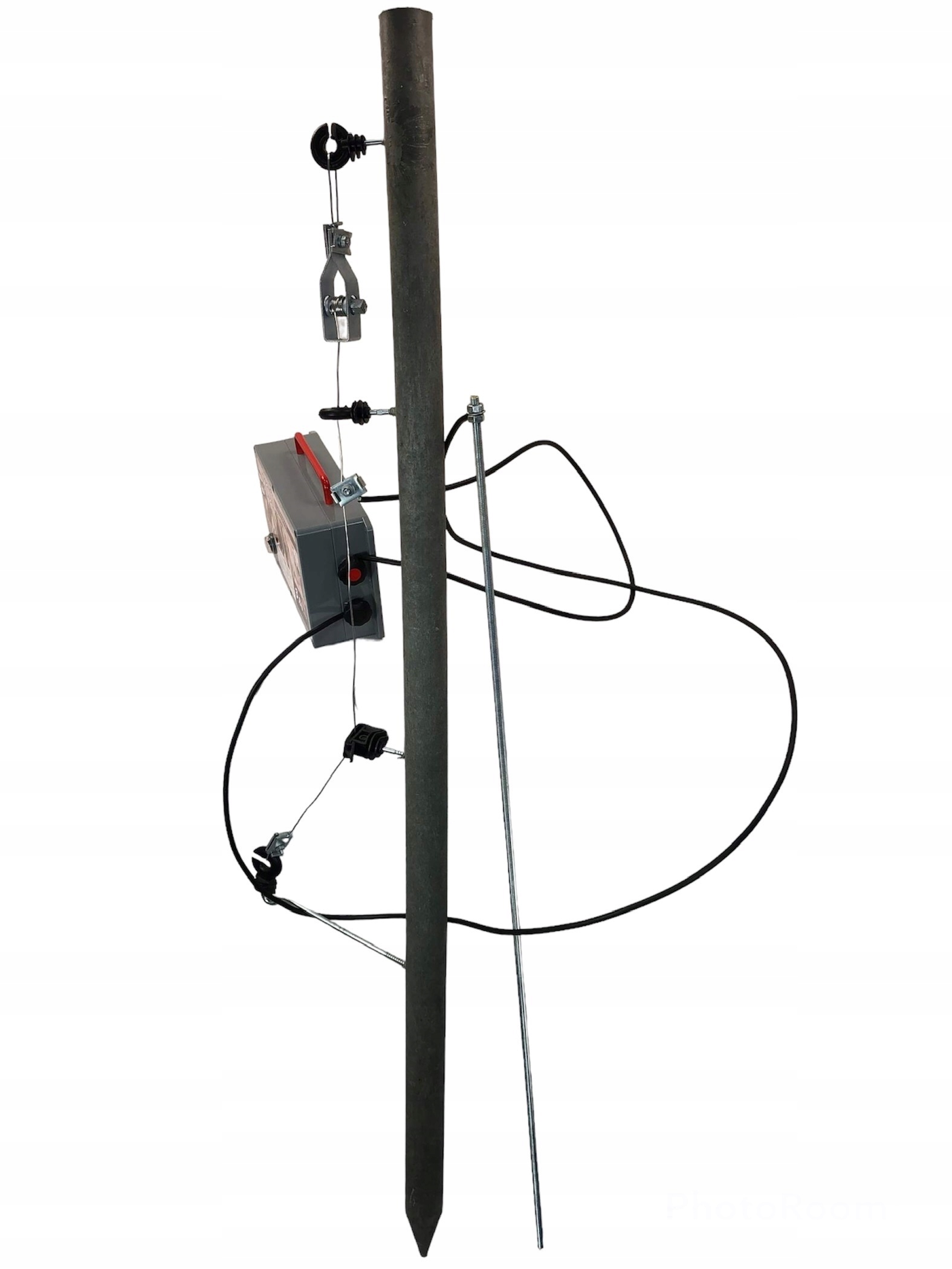 Кол, кабели, заземление, изоляторы, провод, натяжитель, разъем, которые видны на фото, приобретаются отдельно.