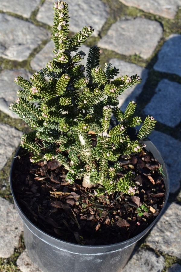Пихта Оберон, карликовый сорт без направляющей – растет неравномерно, достаточно плоская, но компактная, достаточно плоская, со временем принимает ширококоническую форму. Хвойное дерево растет медленно и через 10 лет достигает примерно 80 см в высоту и 50 см в диаметре. У него светло-зеленые плоские иглы, расходящиеся вокруг коротких побегов. Характерной особенностью этого сорта являются белые зимние бутоны.