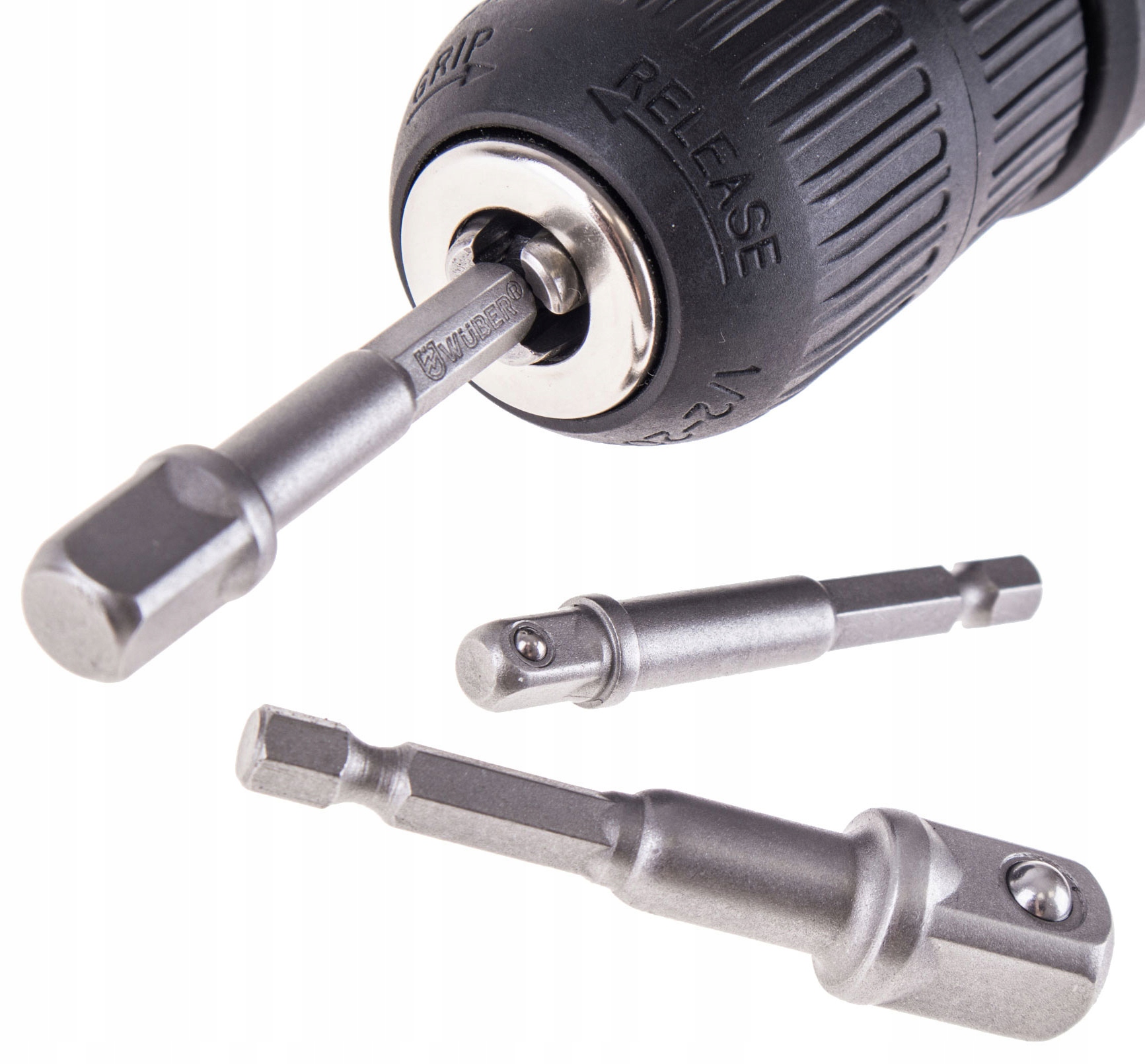 Редукционный набор WUBER позволяет использовать торцевые головки с квадратным хвостовиком в популярные размеры 1/4, 3/8 и 1/2