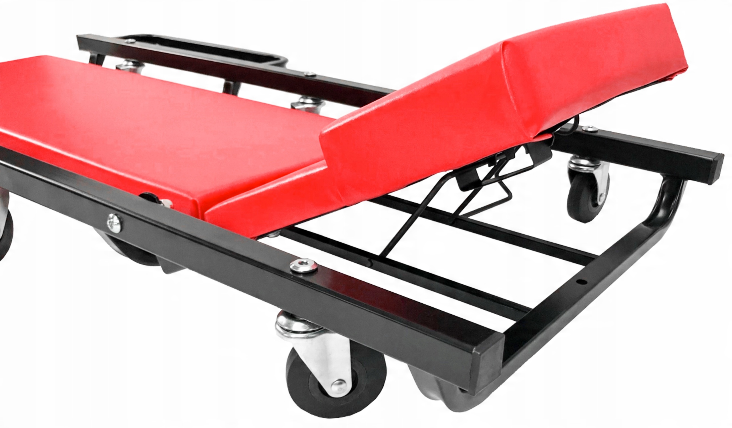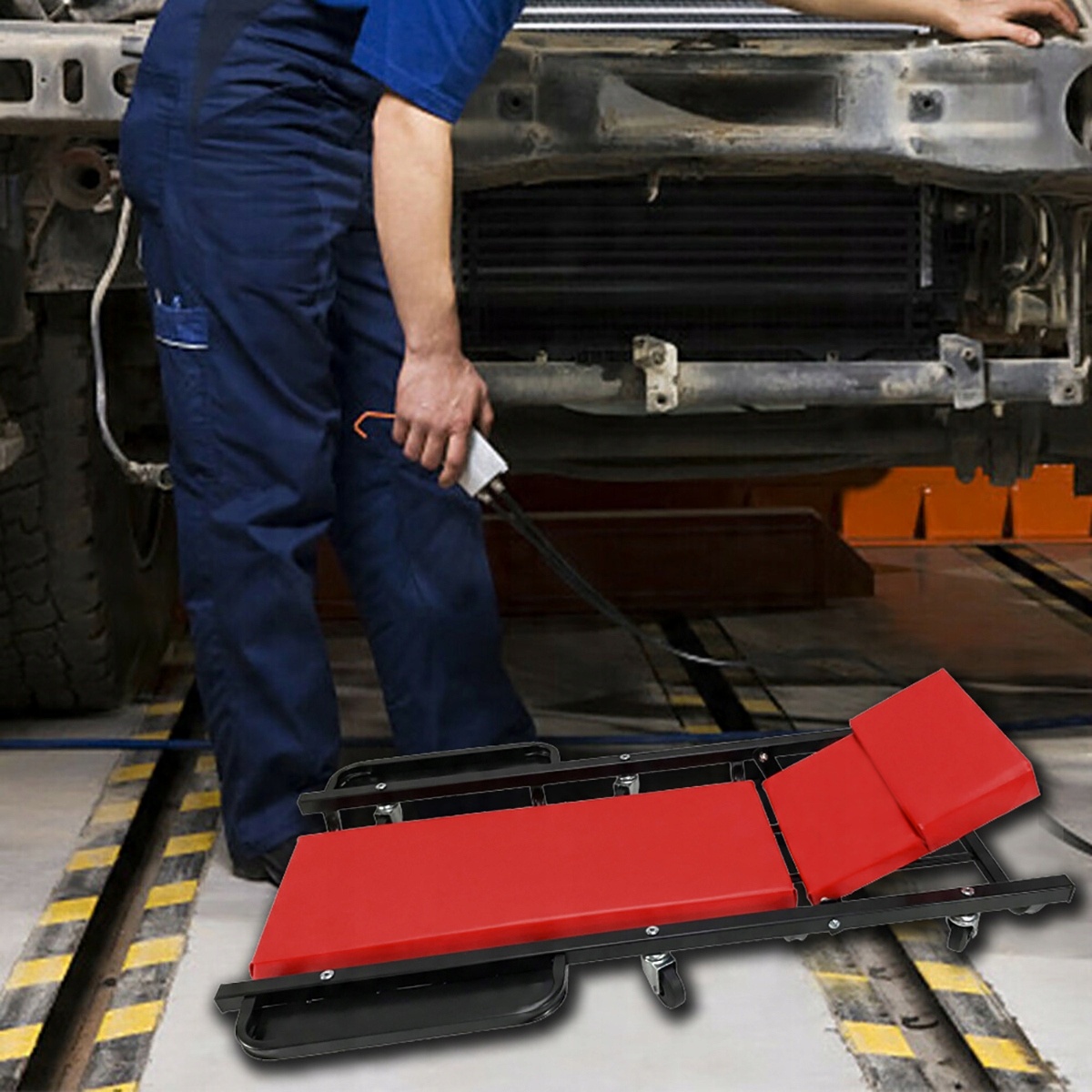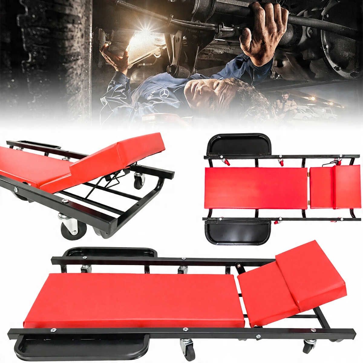 Металлическая конструкция стенда делает его незаменимым элементом оборудования автосервиса. Конструкция кушетки для мастерской основана на 6 резиновых опорных колесах, которые позволяют перемещать ее в любом направлении. Имеет две практичные полки для инструментов, которые можно сложить. Разработан специально для автомехаников.